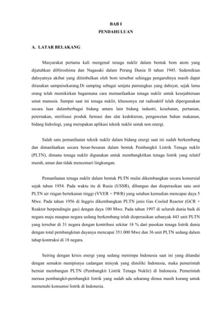 Tak ayal segala hal berbau nuklir kerap dihindari banyak. Latar Belakang Masyarakat pertama kali mengenal tenaga nuklir dalam bentuk bom atom yang dijatuhkan di Hiroshima dan Nagasaki dalam Perang Dunia II tahun 1945. Kaninda Rosalina Amanda Kelas.